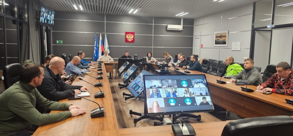 Совещание прошло в смешанном формате — часть участников присутствовала в штабе на Соловках, остальные присоединились по видео-конференц-связи.